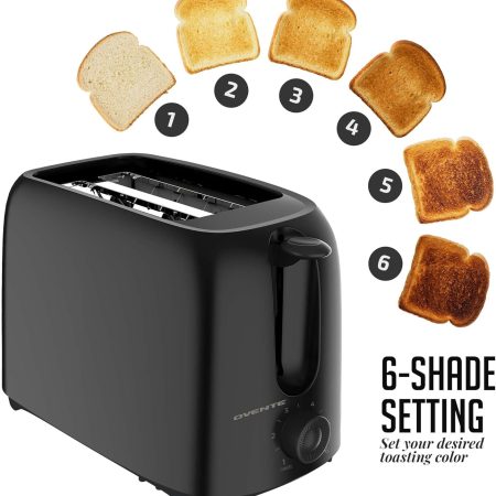 OVENTE Electric 2 Slice Toaster Machine with 6-Shade Toast Settings, 700W Power, Removable Crumb Tray and Compact Design Perfect for Toasting Bread, Bagels, Waffles and Puff Pastry, Black TP2210B