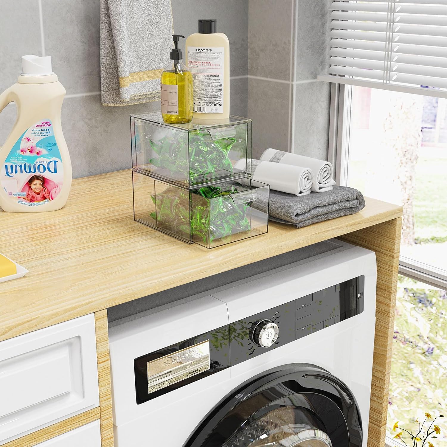 With two stackable drawers, this organizer offers ample space to store your makeup, skincare products, jewelry, and other essentials. The transparent design allows you to easily see and access your items, while the convenient handles make it effortless to pull out the drawers.